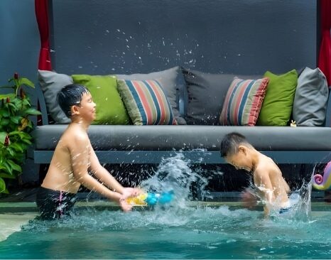 Ideal for families, friends, or groups, our Two Bedroom Private Pool Villa offers privacy, comfort, and tropical charm. Featuring two bedrooms with en-suite bathrooms, a private pool surrounded by lush gardens, and spacious indoor-outdoor living and dining areas, it’s perfect for relaxation and socializing.